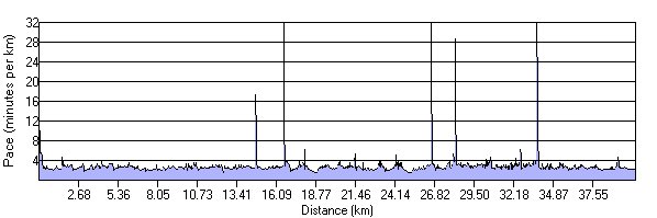 Lähtölaukauksen jälkeen siinä luistellessani yritin viritellä mp3-soitinta soimaan. Kun se sain toimimaan niin otin muutamia teräviä potkuja ja pääsin pahimpien ruuhkien ohitse. Sykkeet tietty 170 korvilla. Joissain vaiheessa rupesin miettimään, että mitenkä jätkän käy, jos noilla sykkeillä alusta asti mennään. Heti alusta alkaen oli tarkoitus oli saada kärkijoukkoa kiinni, jonka vauhdissa oli tarkoitus yrittää mennä niin kauan kuin jaksaa. Kun sain kärkeä kiinni niin siinä vaiheessa 17 km kohdalla oikea luistin tökkäisi johonkin. Huomasin, että yksi rengas luistimesta ei pyöri. Ajattelin, että kivi olisi mennyt renkaan väliin, joten seis ja luistin pois jalasta. Kas kummaa pyörän akselia ei missään ja rengas irti. No, voihan vitsi. Rengas juomalaukkuun ja menoksi. Sen kilometriaika olikin sitten 4:28 min/km kun muuten matka kulki siinä 2:30 min/km vauhdilla. Siinä vaiheessa olin jo tippunut kärjen vauhdista. Matkan jatkuessa ajattelin, että toivottavasti muut renkaat pysyvät kiinni. Puolessa välin matkaa aika oli 53:17 eli 3:10 parempi kuin viime vuonna.
