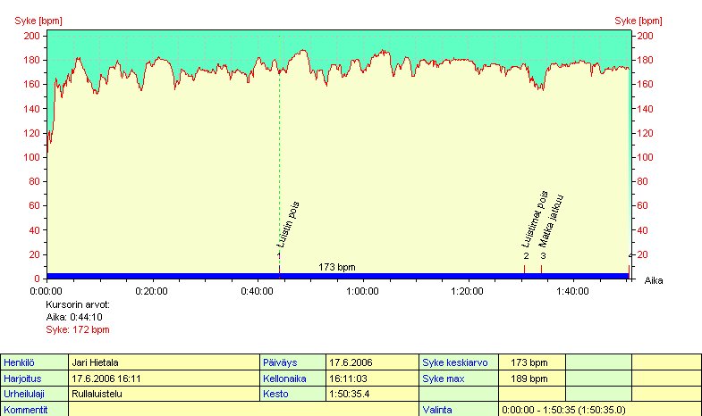Keskivauhti matkalla oli 2:46 min/km. Hyvin jaksoi painaa helteestä huolimatta ja vasen luistinkaan ei painanut joten ei puutumisia. Vai johtuikohan se siitä, että luistimien kanssa sai pelailla muutenkin matkan aikana. Aika oli ihan hyvä ottaen huomioon muutamat pysähtymiset luistimien takia.